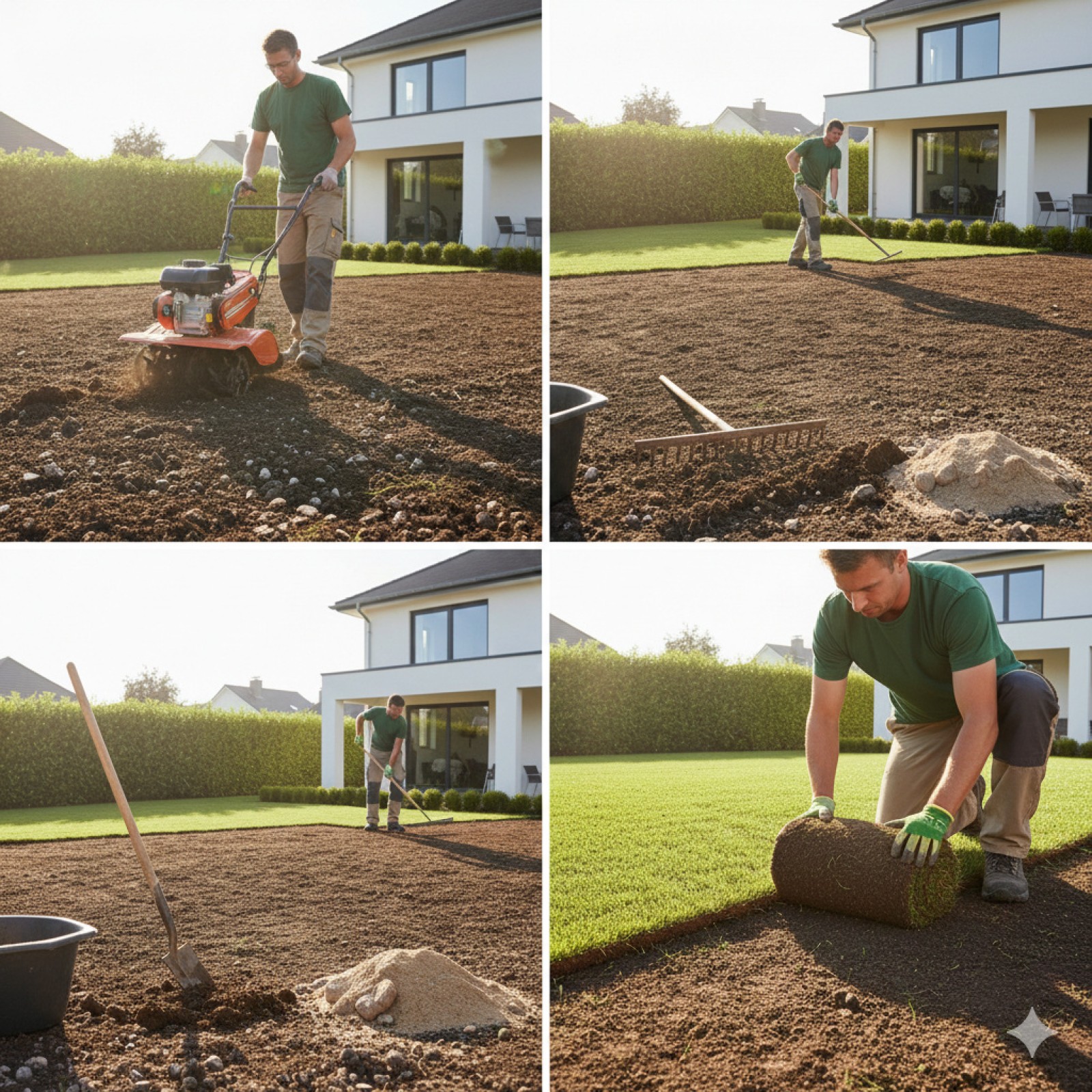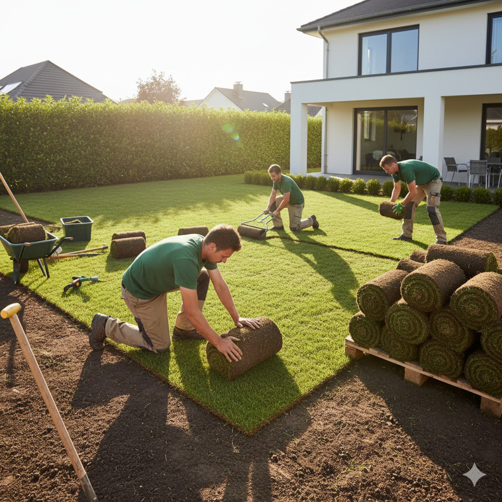 - Livraison et déroulement des rouleaux : les bandes de gazon sont posées bord à bord.
