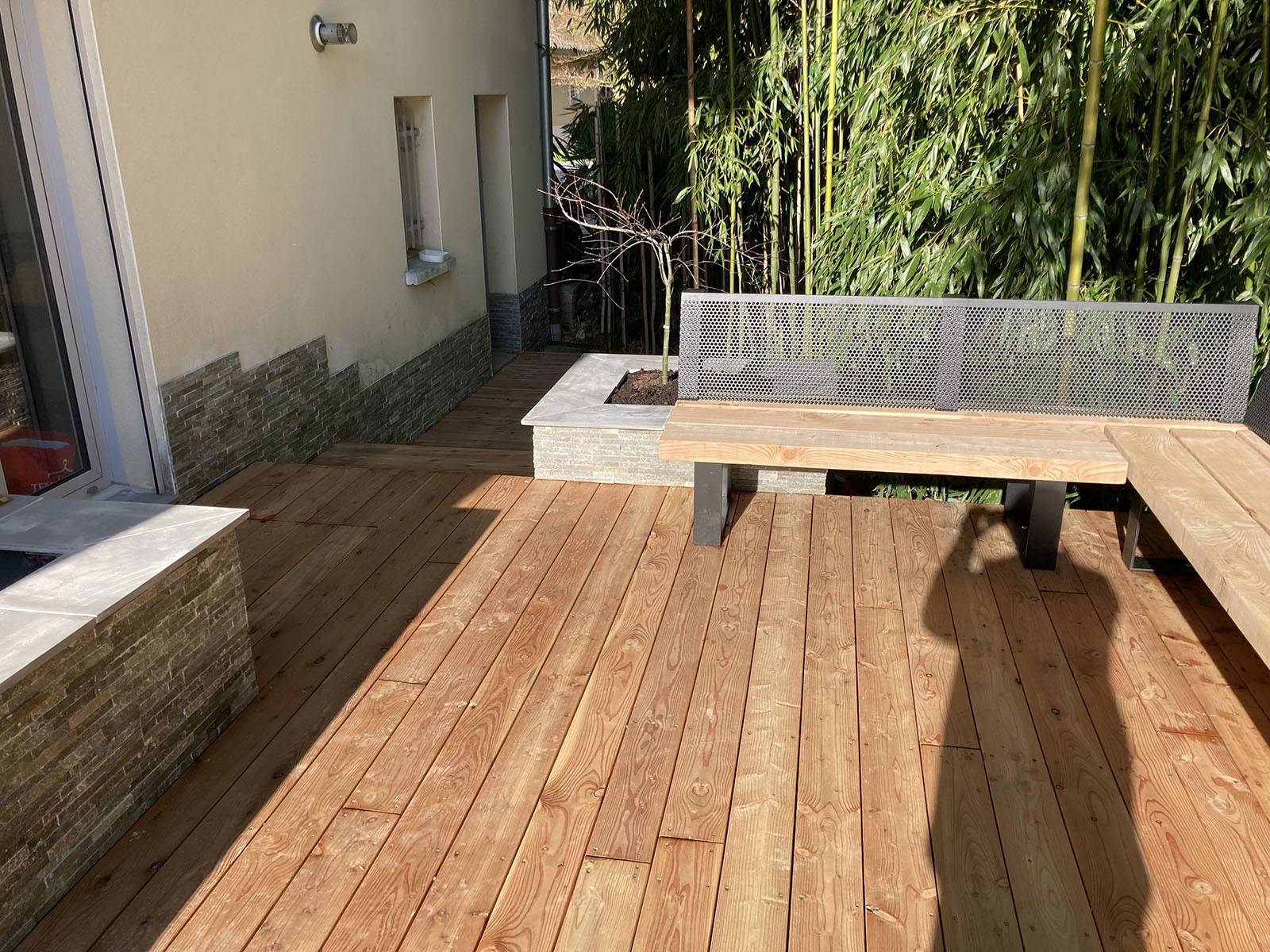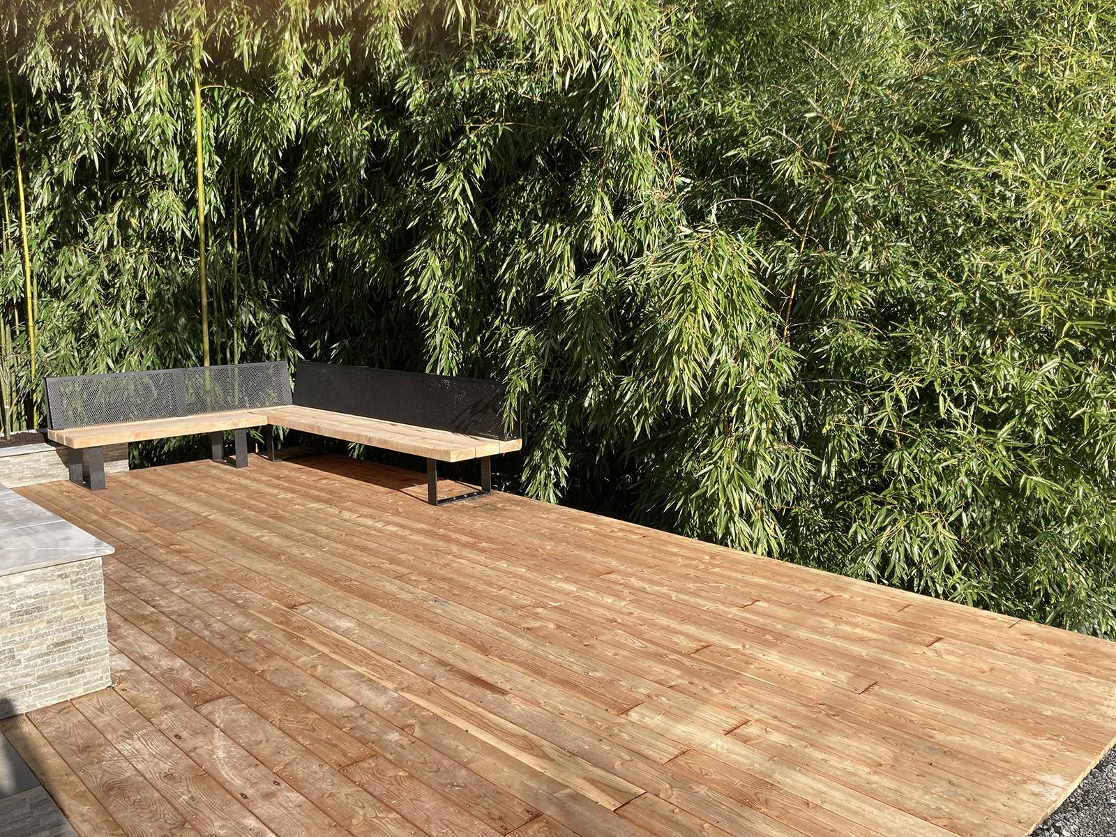 Les aménagements d'agréments permettent d'intégrer la nouvelle terrasse dans le jardin existant.